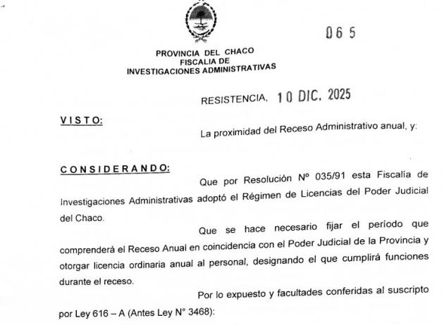 A través de la Resolución N° 65, la Fiscalía de Investigaciones Administrativas (FIA) del Chaco oficializó el período de receso administrativo anual para la temporada 2025-2026. La medida, que lleva la rúbrica del pasado 10 de diciembre, establece el cronograma de funcionamiento del organismo durante el verano.