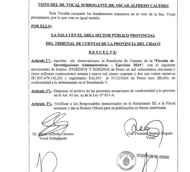Con las firmas de los vocales Cra. Beatriz Bogado y el Dr. Alfredo Cáceres, La Sala I del Área del Sector Público Provincial del Tribunal de Cuentas de la Provincia del Chaco, notificó la Resolución N° 78 de julio de 2025, en la cual se menciona que la cuenta corresponde a l movimiento de fondos del presupuesto operados desde el 1 de enero hasta el 31 de diciembre de 2024, los que fueron sometidos al análisis previsto en el artículo 42 de la Ley N° 831-A.